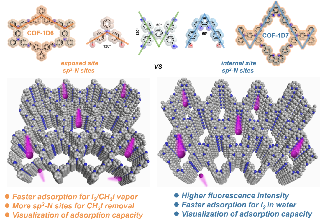 COFs材料凭借其稳定性、高比表面积、丰富孔结构及非金属特性被广泛应用于吸附剂领域。其中亚胺基COFs通过席夫碱反应合成,富含亚胺氮活性位点,可捕获I₂和CH₃I。在此基础上,通过灵活组合合成单元引入不同类型氮位点,可进一步提升碘捕获能力。通过巧妙设计开发了多种高吸附性能的COFs吸附剂。然而其在吸附速率方面仍存在显著差距。因此,提升COFs的碘捕获速率已成为亟待突破的关键瓶颈。研究表明sp3-N与CH3I具有强反应性,可提升对CH3I吸附速率。2024级春季博士生李轲设计组装富含暴露性sp3-N位点的一维共价有机框架材料,用于超快速碘和碘甲烷的吸附,并通过荧光强度实现吸附进程的可视化监测在线发表于Chemical Science。