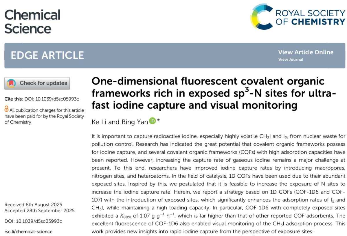 2024级博士生李轲的研究成果:设计组装富含暴露性sp3-N位点的一维共价有机框架材料,用于超快速碘和碘甲烷的吸附,并通过荧光强度实现吸附进程的可视化监测在线发表于Chemical Science