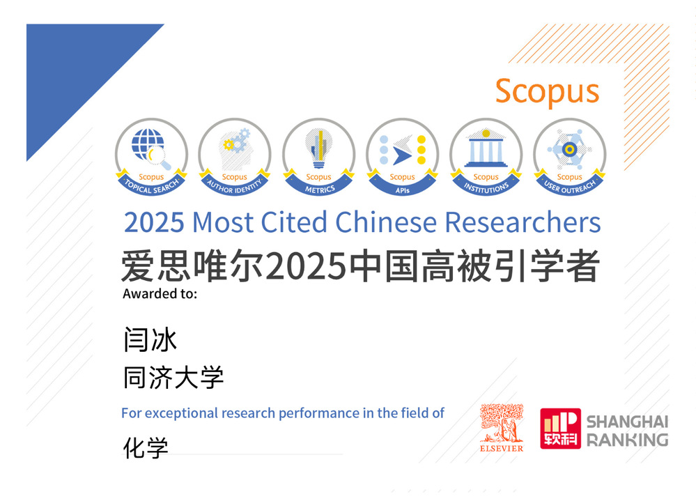 所高校、企业及科研机构,覆盖了教育部10个学科领域、83个一级学科。其中化学学科入选500人。自2014年该榜单首次公布以来,闫老师连续十二年入选该榜单,其中2014-2019前六年入选“材料科学”榜单,2020-至今入选“化学”榜单。