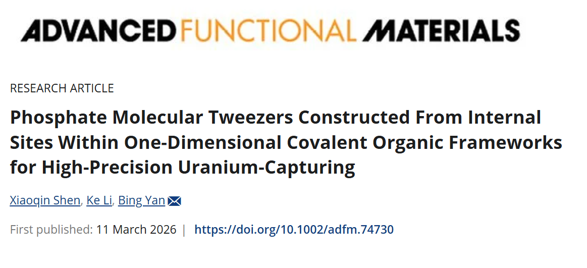 2022级博士生沈晓钦通过对含羟基官能团的1D COFs进行磷酸化修饰,成功在COFs的孔道内构建了铀酰(UO22+)特异性纳米陷阱,实现了对其精准捕获,相关成果以“Phosphate Molecular Tweezers Constructed From Internal Sites Within One-Dimensional Covalent Organic Frameworks for High-Precision Uranium-Capturing”为题在线发表于《先进功能材料》(Advanced Functional Materials, 2026, e74730)。