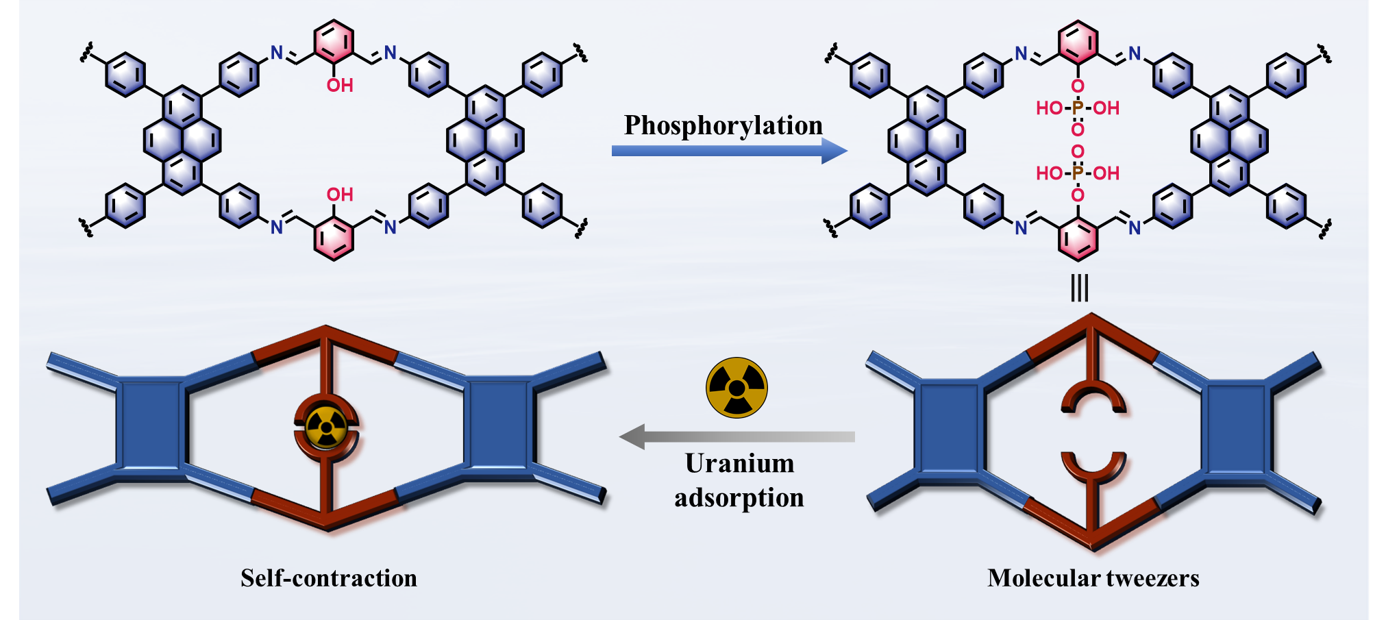 传统吸附材料通常依赖简单的化学配位作用实现对UO22+的捕获,但往往存在选择性不足、吸附效率有限等问题。针对这一挑战,研究人员提出了一种“分子镊子”的结构设计理念。该策略以具有规则孔道结构且分子链具备一定柔性的1D COFs(2-OH-PyDFP)为母体框架,通过对孔道内部的羟基位点进行磷酸化修饰,构建得到了具有“磷酸分子镊子”结构特征的功能化材料2-Phos,从而实现对UO22+的动态捕获。理论计算结果表明,当孔道一侧的磷酸基团首先识别并结合UO22+后,菱形孔道会产生明显的自收缩效应,“分子镊子”两端之间的距离会从13.0 Å缩至11.0 Å,这一结构响应进一步促进另一侧磷酸基团与UO22+形成协同配位,从而实现对UO22+的双位点协同吸附。这种亚纳米级尺度的结构调节过程有力地证实了双磷酸协同捕获UO22+的作用机制。